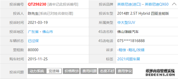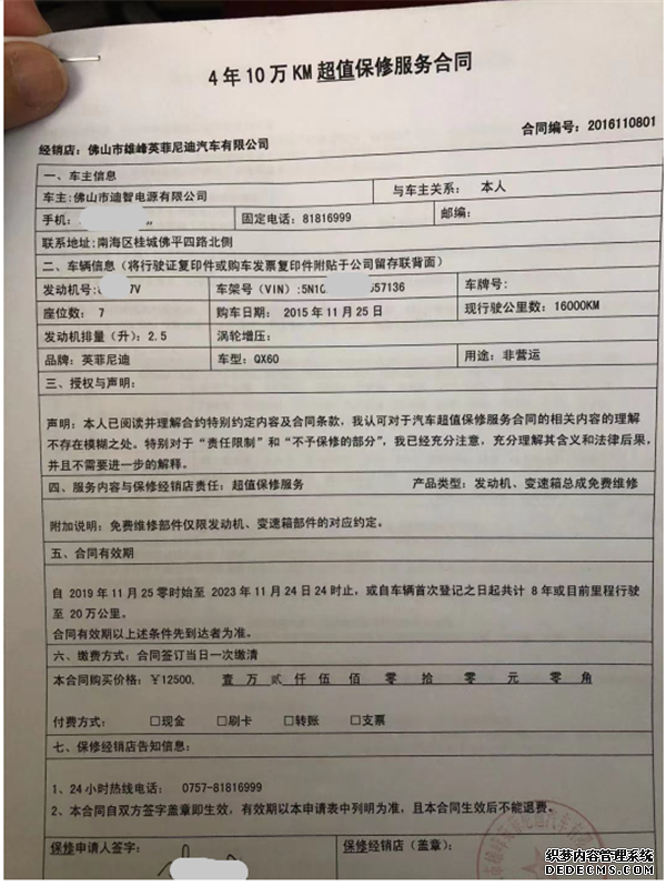 為了維護(hù)車主的合法利益,同時也是為了對相關(guān)涉事企業(yè)進(jìn)行監(jiān)督,小編撥通了這位陳先生的電話。在電話中,陳先生向小編描述,他在2015年的年底購買了一輛英菲尼迪QX60車型。由于在購買后不久便在車友的口中得知英菲尼迪QX60普遍存在的變速箱問題,所以在之后當(dāng)事人便到4S店專門花一萬二購買了一份延長保修的項目,同時也是給自己買一份安心。