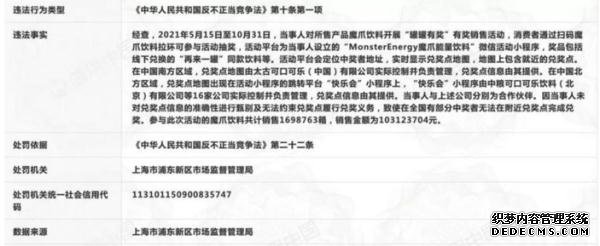 據(jù)上述行政處罰決定書披露,參與此次活動的魔爪飲料共計銷售1698763箱,銷售金額為103123704元。