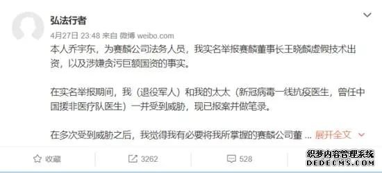 不到一年,王曉麟?yún)s遭該公司一法務(wù)員工實名、公開舉報,罪名很嚇人:涉嫌貪污國有資產(chǎn)。舉報者喬宇東本是賽麟公司法務(wù)員工,2019年10月,他向檢查、國資和審計部門舉報了王曉麟虛假技術(shù)出資及涉嫌貪腐的情況,卻被賽麟公司以涉嫌侵害己方商譽為由報案,但因未達到立案條件而未被公安機關(guān)立案。