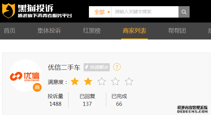 聚投訴數(shù)據(jù)顯示,截至2020年7月8日下午17:00,優(yōu)信投訴量達(dá)2128條,投訴內(nèi)容多和“套路貸”有關(guān),解決率為35.86%;黑貓投訴上關(guān)于優(yōu)信的投訴有1488條,已完成解決量僅為66條。