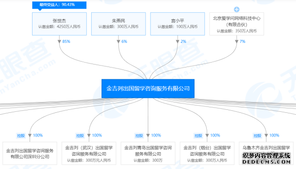 天眼查顯示,金吉列留學(xué)第一大股東為自然人張世杰,直接持股85%;北京愛學(xué)問網(wǎng)絡(luò)科技中心(有限合伙)持股7%,是第二大股東;朱燕民(董事長、經(jīng)理)持股6%,是第三大股東,宮小平為第四大股東,持股2%。而北京愛學(xué)問網(wǎng)絡(luò)科技中心(有限合伙)的第一大股東也為張世杰,持股77.53%。
