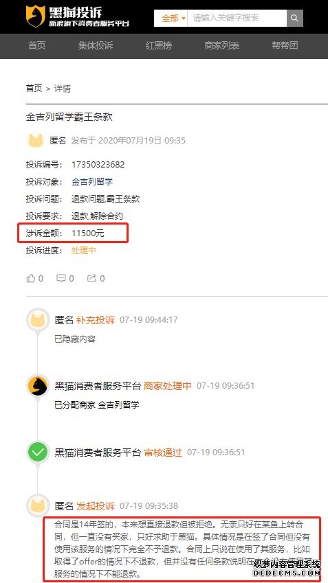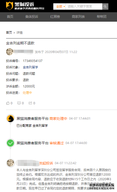 據(jù)不完全統(tǒng)計,截至7月23日,僅黑貓投訴及聚投訴2個平臺關(guān)于金吉列留學(xué)的相關(guān)投訴達到40多個,投訴內(nèi)容涉“霸王條款”、“拒不退款”等。