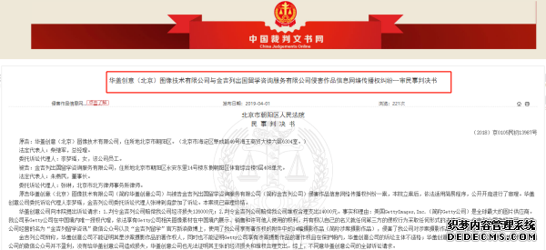 2019年4月份,中國裁判文書網(wǎng)發(fā)布的“華蓋創(chuàng)意(北京)圖像技術(shù)有限公司與金吉列出國留學(xué)咨詢服務(wù)有限公司侵害作品信息網(wǎng)絡(luò)傳播權(quán)糾紛一審民事判決書”顯示,金吉列留學(xué)因侵害作品信息網(wǎng)絡(luò)傳播權(quán)糾紛,被華蓋創(chuàng)意(北京)圖像技術(shù)有限公司(簡稱“華蓋創(chuàng)意公司”)起訴。