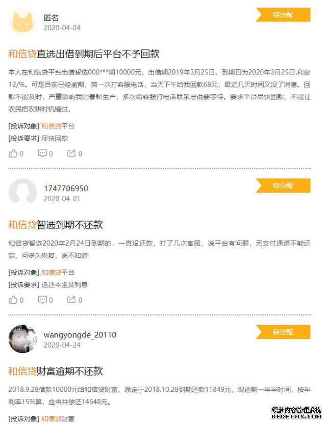 在黑貓投訴平臺(tái)上,有用戶投訴稱,和信貸平臺(tái)原定于2020年2月到期,直到現(xiàn)在也沒打款,問客服卻回答說不能還款,多久恢復(fù)也不知道;也有用戶投訴稱,2018年9月出借給和信貸財(cái)富10000元,原定于2018年10月到期還款11849元,直到2020年4月仍未還款,逾期一年半時(shí)間。