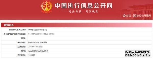 ???央廣網(wǎng)北京10月27日消息據(jù)中國執(zhí)行信息公開網(wǎng)顯示,10月26日,橫店影視股份有限公司(以下簡稱“橫店影視”)被張掖市甘州區(qū)人民法院列為被執(zhí)行人,案號為(2020)甘0702執(zhí)6289號,執(zhí)行標(biāo)的為30萬元。據(jù)悉,這是橫店影視首次成為被執(zhí)行人。