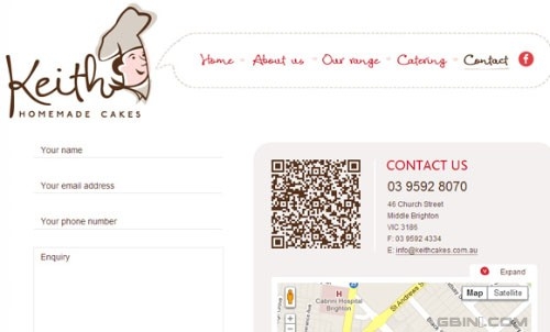 但是最近我發(fā)現一些站點巧妙的將編碼融入到設計中,因為它們經常出現在打印中,所以你很少注意到它們。但是隨著時間的增長,由于數據傳輸越來越快,QR 編碼會成為流行趨勢。你可以在Keith Cakes 聯系頁面看到此技術鮮明的例子。