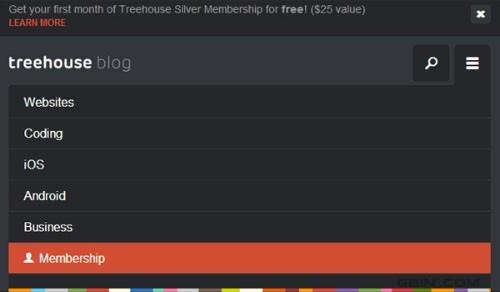 進入移動導航切換菜單漂亮的設計趨勢,Treehouse Blog是極少數將此技術在智能手機和pc端瀏覽器表現都很耀眼的例子之一。但是有許多網站和工作室在他們的個人響應式布局中使用了此趨勢。