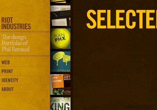 Riot Industries的組合對于新設計師是個很好的例子。查看一下導航鏈接是如何工作的,在移動上去是整個組合動的效果是如何實現的。邊框紋理確實展現了一個左右兩列分開的線。
