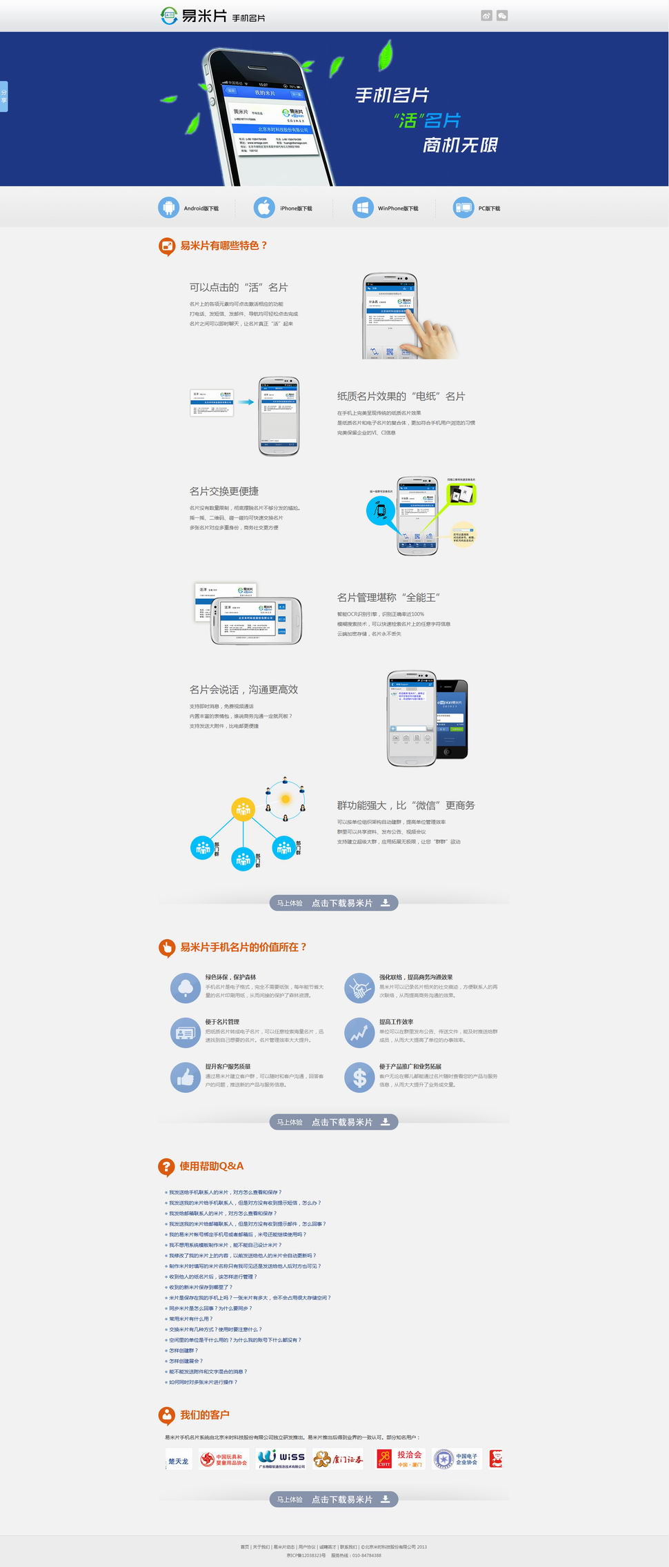 米時(shí)科技專(zhuān)注于基于iPhone、Android等智能手機(jī)平臺(tái)的新一代商務(wù)社交網(wǎng)絡(luò)的設(shè)計(jì),開(kāi)發(fā)和運(yùn)營(yíng);開(kāi)創(chuàng)性地將傳統(tǒng)的名片概念引入移動(dòng)社交網(wǎng)絡(luò),讓使用者可以以交換和管理電子名片為入口,重新拓展和維系真實(shí)生活中的人脈網(wǎng)絡(luò),發(fā)現(xiàn)身邊有價(jià)值的人,同時(shí)收獲新的商機(jī)。